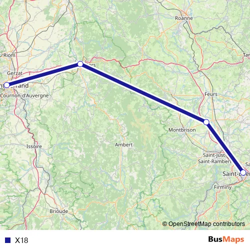 The first stop of the X18 bus route is St-Etienne-Châtcrx. G Routière and the last stop is Clermont-Ferrand. X18 is operational during everyday.