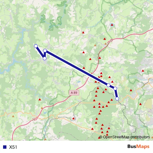 The first stop of the X51 bus route is Les Ancizes St Georges Bourg and the last stop is Volvic. X51 is operational during on weekdays.