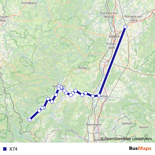 The first stop of the X74 bus route is Valence TGV Rhône-Alpes Sud and the last stop is Les Vans Centre. X74 is operational during everyday.