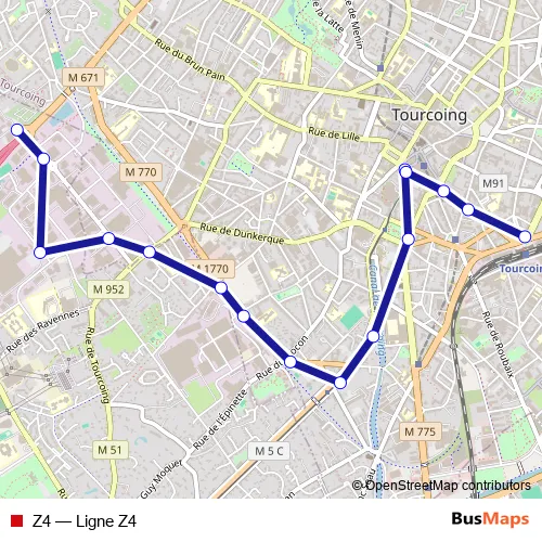 The first stop of the Z4 bus route is Bondues Ravennes and the last stop is Tourcoing Gare. Z4 (Ligne Z4) is operational during on weekdays.