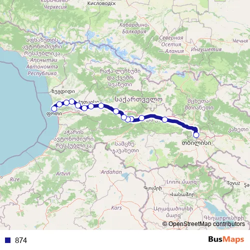 The first stop of the 874 rail route is Tbilisi and the last stop is
