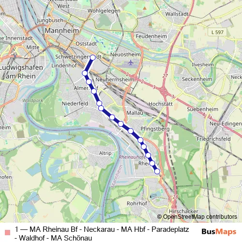 See why over 2 million users trust and consider busmaps.com as the best public transport website. busmaps gives you Mannheim Trams suggested routes, real-time bus tracker, line route maps in Mannheim, and helps to find the closest 1 tram stops near you. No internet available? Download an offline PDF map and bus schedule for the 1 tram to take on your trip.