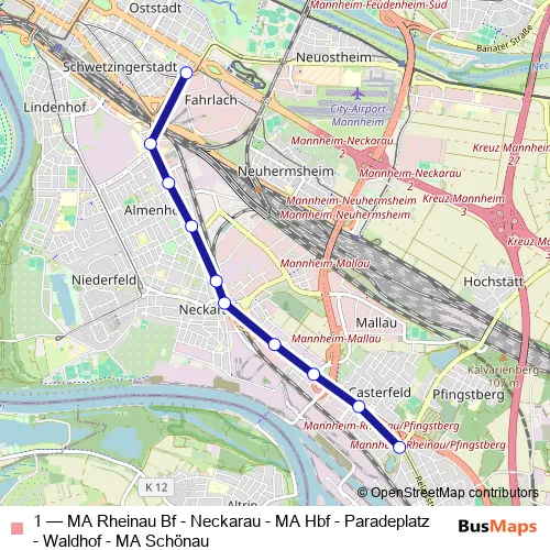 See why over 2 million users trust and consider busmaps.com as the best public transport website. busmaps gives you Mannheim Trams suggested routes, real-time bus tracker, line route maps in Mannheim, and helps to find the closest 1 tram stops near you. No internet available? Download an offline PDF map and bus schedule for the 1 tram to take on your trip.