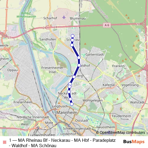 The first stop of the 1 tram route is Schönau and the last stop is Alte Feuerwache. 1 (MA Rheinau Bf - Neckarau - MA Hbf - Paradeplatz - Waldhof - MA Schönau) is operational during everyday.
