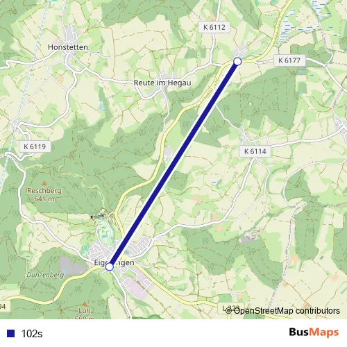 The first stop of the 102s bus route is Eigeltingen, Germania and the last stop is