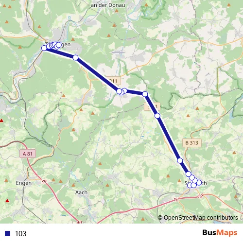 The first stop of the 103 bus route is Stockach (KN), Busbahnhof and the last stop is Tuttlingen, ZOB Stadtmitte. 103 is operational during on weekdays.