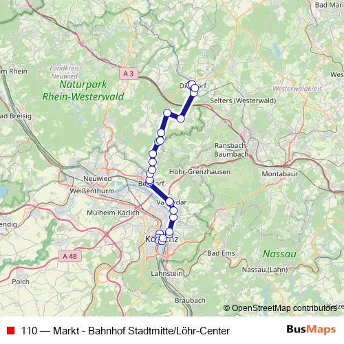 The first stop of the 110 bus route is Koblenz Bahnhof Stadtmitte/Löhr-Center and the last stop is Dierdorf Markt. 110 (Markt - Bahnhof Stadtmitte/Löhr-Center) is operational during everyday.