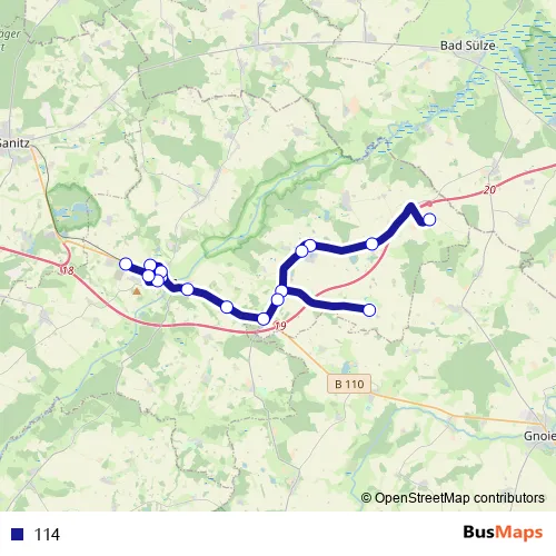 The first stop of the 114 bus route is Grammow and the last stop is Tessin(b Rostock) Klein Tessin. 114 is operational during on weekdays.