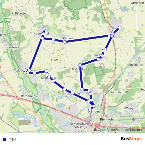 The first stop of the 116 bus route is Braunschweig Heideblick and the last stop is Braunschweig Heideblick. 116 is operational during everyday.