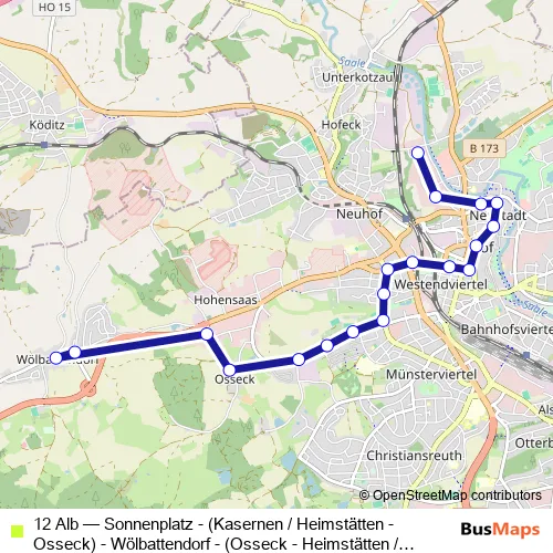 Bus 12 Alb - Sonnenplatz - (Kasernen / Heimstätten - Osseck) - Wölbattendorf - (Osseck - Heimstätten / Kasernen) - Sonnenplatz: Full Schedule in Hof