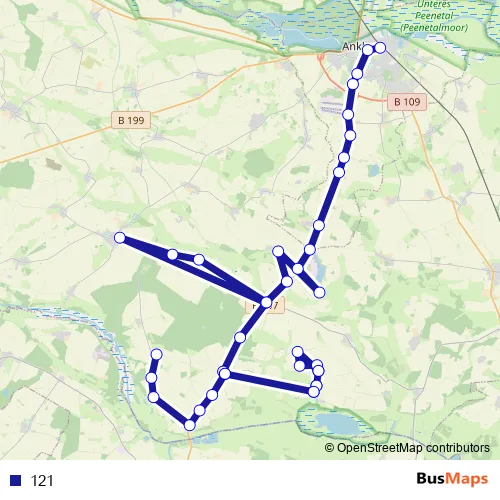 The first stop of the 121 bus route is Anklam Zob and the last stop is Rubenow (b Anklam). 121 is operational during on weekdays.