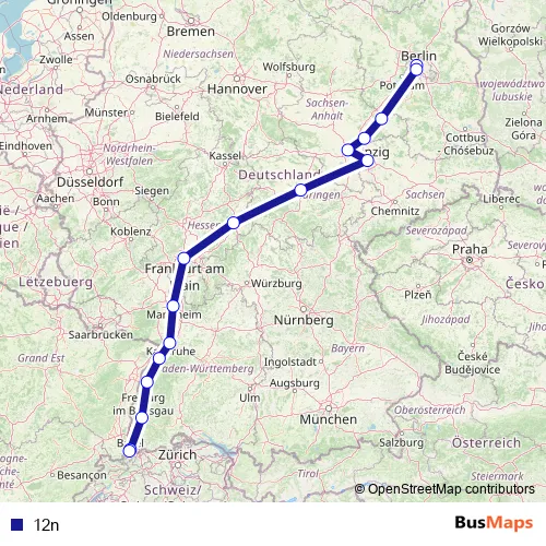 The first stop of the 12n rail route is Basel Sbb and the last stop is S+U Berlin Hauptbahnhof. 12n is operational during everyday.