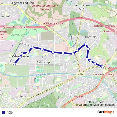 See why over 2 million users trust and consider busmaps.com as the best public transport website. busmaps gives you Hannover Buses suggested routes, real-time bus tracker, line route maps in Hannover, and helps to find the closest 135 bus stops near you. No internet available? Download an offline PDF map and bus schedule for the 135 bus to take on your trip.