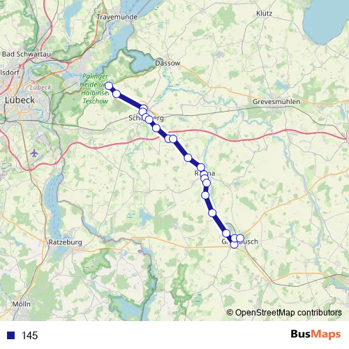 The first stop of the 145 bus route is Selmsdorf Straße der Freiheit and the last stop is Gadebusch Zob. 145 is operational during everyday.