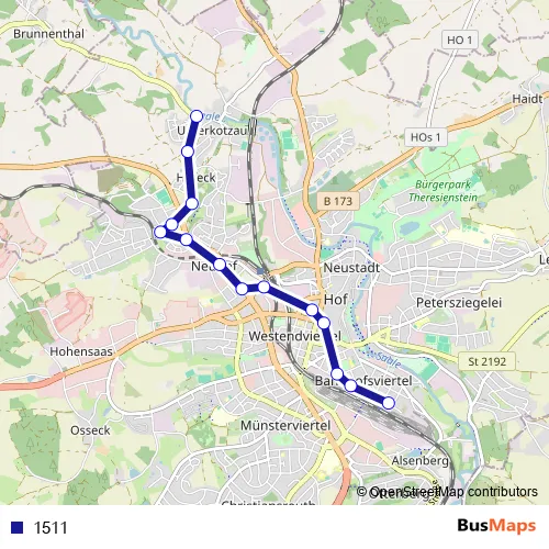 The first stop of the 1511 bus route is Unterkotzau and the last stop is Hof Hbf. 1511 is operational during everyday.