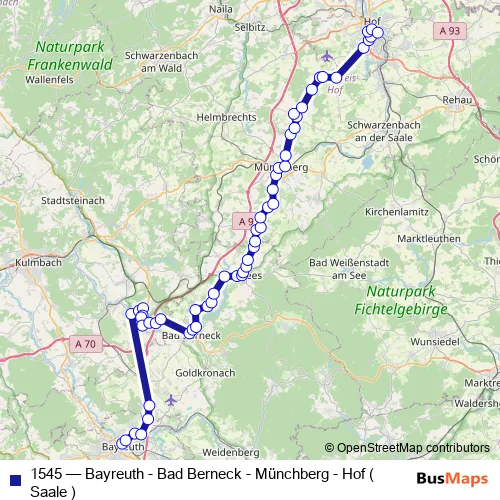 The first stop of the 1545 bus route is Bad Berneck Busbahnhof and the last stop is Hof (Saale) Hbf. 1545 (Bayreuth - Bad Berneck - Münchberg - Hof ( Saale )) is operational during everyday.