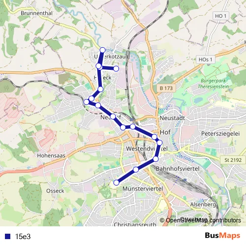 See why over 2 million users trust and consider busmaps.com as the best public transport website. busmaps gives you Hof Buses suggested routes, real-time bus tracker, line route maps in Hof, and helps to find the closest 15e3 bus stops near you. No internet available? Download an offline PDF map and bus schedule for the 15e3 bus to take on your trip.