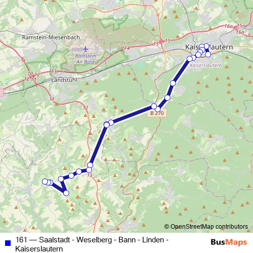 The first stop of the 161 bus route is Kaiserslautern, Hbf Bstg C1 and the last stop is Saalstadt, Eckstraße. 161 (Saalstadt - Weselberg - Bann - Linden - Kaiserslautern) is operational during on weekdays.