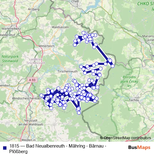The first stop of the 1815 bus route is Aussiedlerhof Schmid and the last stop is Wernersreuth bei Neualbenreuth. 1815 (Bad Neualbenreuth - Mähring - Bärnau - Plößberg) is operational during on weekdays.
