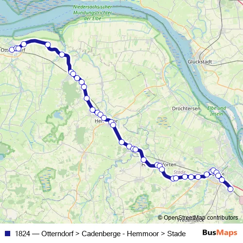 The first stop of the 1824 bus route is Otterndorf Kurbad Krüger and the last stop is Stade, Ottenbecker Damm. 1824 (Otterndorf > Cadenberge - Hemmoor > Stade) is operational during on weekdays.