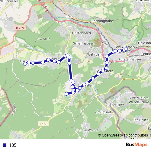 The first stop of the 185 bus route is Schule/Kiga, Friedrichweiler Wadgassen and the last stop is Neues Rathaus, Völklingen. 185 is operational during on weekdays.