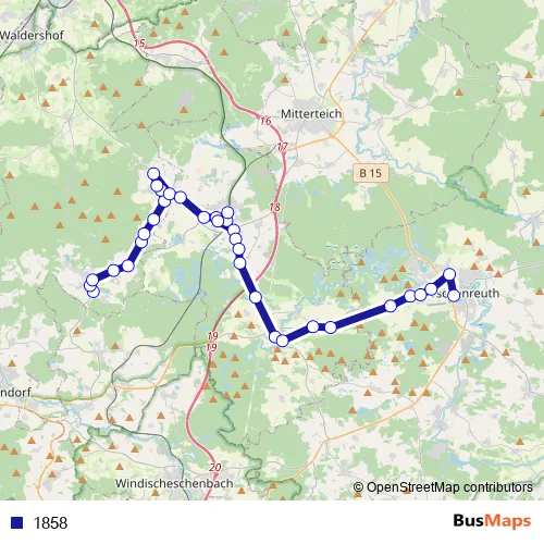 The first stop of the 1858 bus route is Friedenfels, Steinbruckweg and the last stop is Tirschenreuth, ZOB Großparkplatz. 1858 is operational during on weekdays.