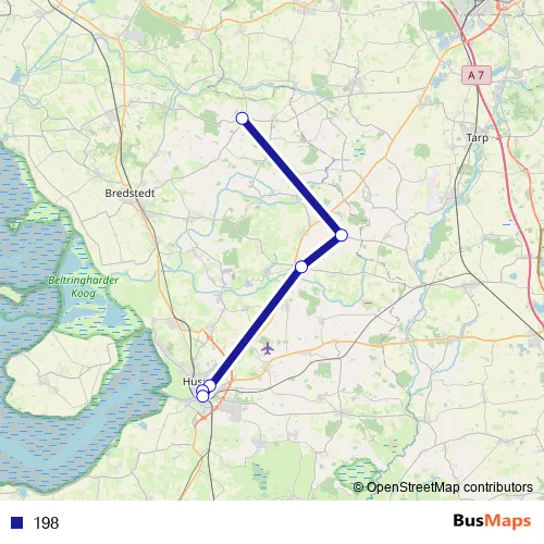 The first stop of the 198 bus route is Husum(Nordsee) Dänische Schule and the last stop is Goldelund Hauptstraße. 198 is operational during everyday.