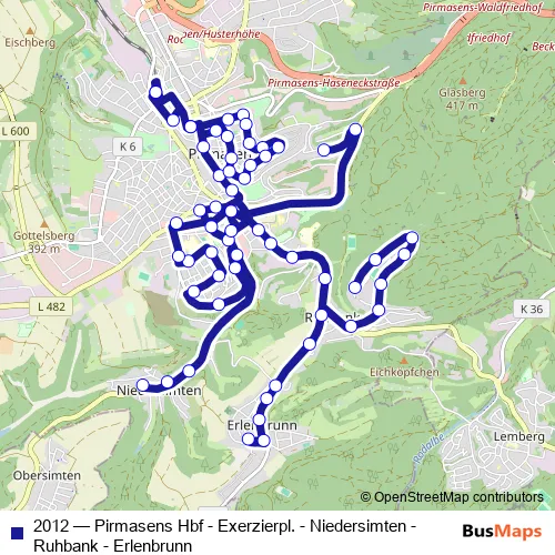 The first stop of the 2012 bus route is Pirmasens, Hauptbahnhof Bstg A and the last stop is Pirmasens, Hauptbahnhof Bstg A. 2012 (Pirmasens Hbf - Exerzierpl. - Niedersimten - Ruhbank - Erlenbrunn) is operational during everyday.