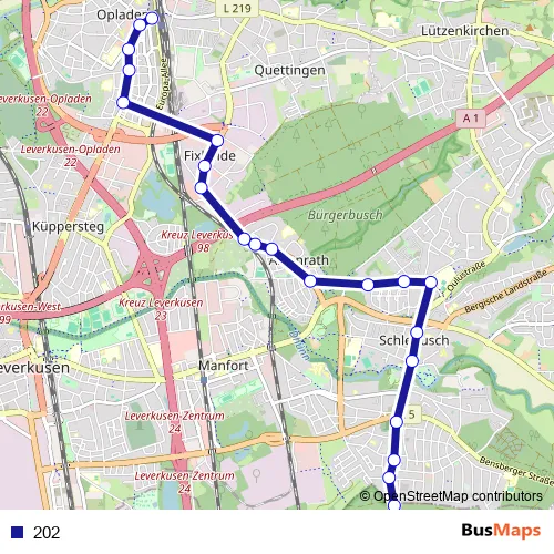 See why over 2 million users trust and consider busmaps.com as the best public transport website. busmaps gives you Leverkusen Buses suggested routes, real-time bus tracker, line route maps in Leverkusen, and helps to find the closest 202 bus stops near you. No internet available? Download an offline PDF map and bus schedule for the 202 bus to take on your trip.