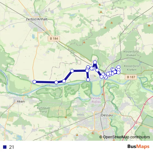 The first stop of the 21 bus route is Roßlau (Elbe), Bahnhof (Bus) and the last stop is Roßlau (Elbe), Bahnhof (Bus). 21 is operational during everyday.