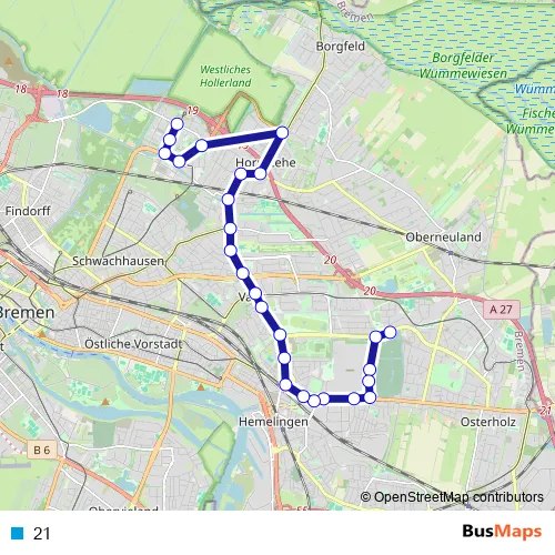 See why over 2 million users trust and consider busmaps.com as the best public transport website. busmaps gives you Bremen Buses suggested routes, real-time bus tracker, line route maps in Bremen, and helps to find the closest 21 bus stops near you. No internet available? Download an offline PDF map and bus schedule for the 21 bus to take on your trip.