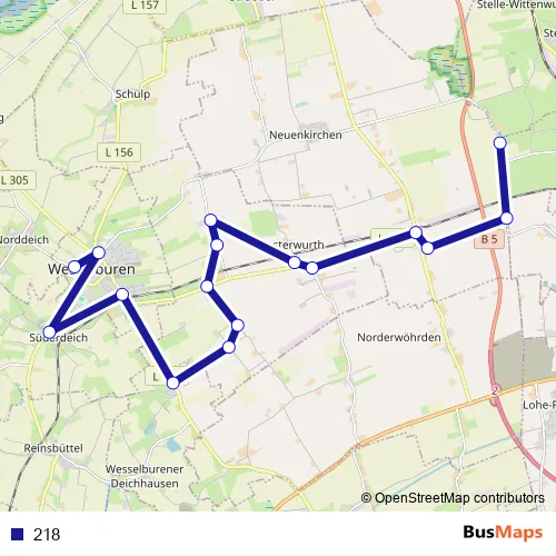 The first stop of the 218 bus route is Wesselburen Grundschule and the last stop is Neuenkirchen(Dithm) Dellweg Ii. 218 is operational during on weekdays.