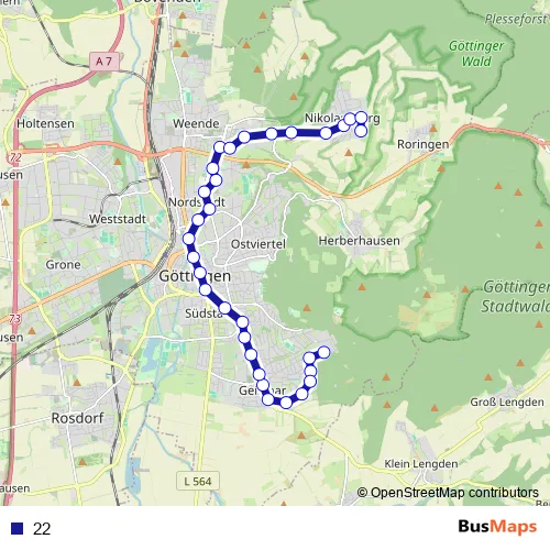 The first stop of the 22 bus route is Göttingen Vor dem Walde and the last stop is Göttingen Auf der Lieth. 22 is operational during everyday.