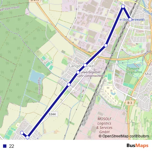 The first stop of the 22 bus route is Kippenheimweiler Westendstraße and the last stop is