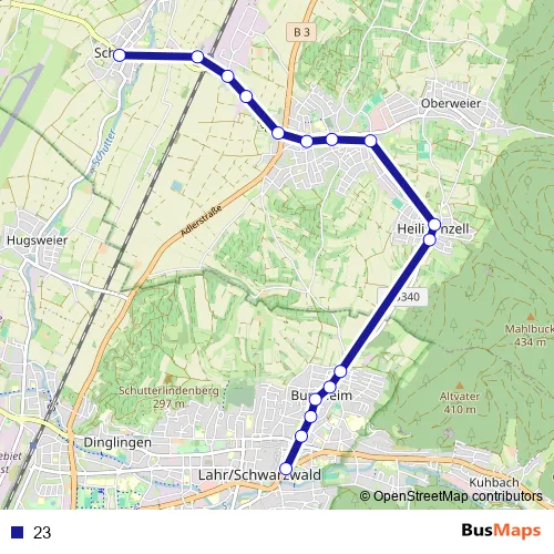 The first stop of the 23 bus route is Lahr Stiftskirche and the last stop is