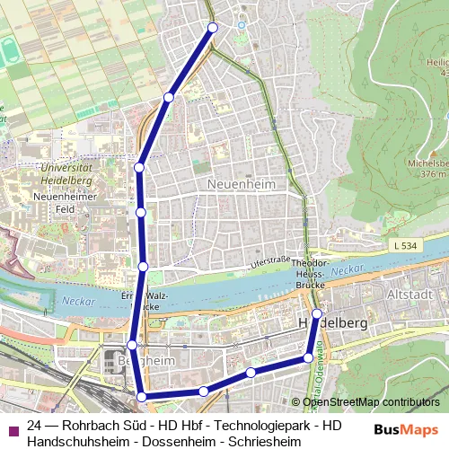 See why over 2 million users trust and consider busmaps.com as the best public transport website. busmaps gives you Heidelberg Trams suggested routes, real-time bus tracker, line route maps in Heidelberg, and helps to find the closest 24 tram stops near you. No internet available? Download an offline PDF map and bus schedule for the 24 tram to take on your trip.