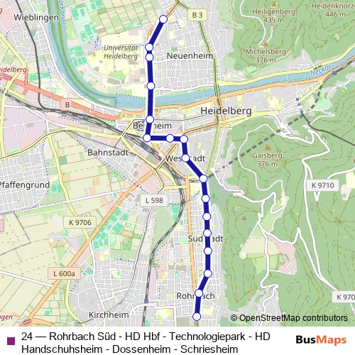 The first stop of the 24 tram route is Ortenauer Straße and the last stop is Heiligenbergschule. 24 (Rohrbach Süd - HD Hbf - Technologiepark - HD Handschuhsheim - Dossenheim - Schriesheim) is operational during on weekdays.