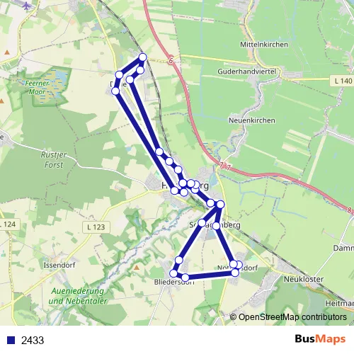 The first stop of the 2433 bus route is Horneburg Bahnhof and the last stop is Horneburg Bahnhof. 2433 is operational during on weekdays.