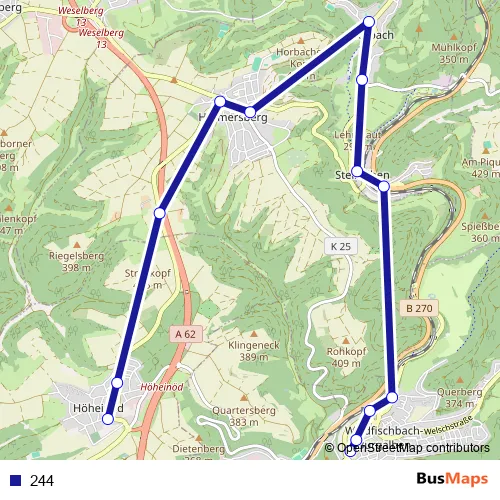 The first stop of the 244 bus route is Waldfischbach, Schule and the last stop is Höheinöd, Thaleischweiler Str.. 244 is operational during on weekdays.