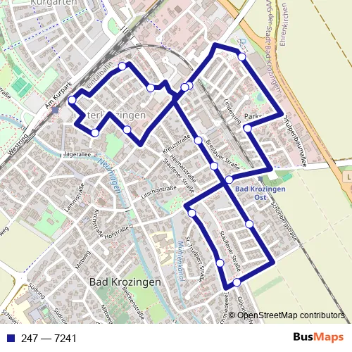 The first stop of the 247 bus route is Bad Krozingen Bf Ostseite and the last stop is Bad Krozingen Bf Ostseite. 247 (7241) is operational during everyday.