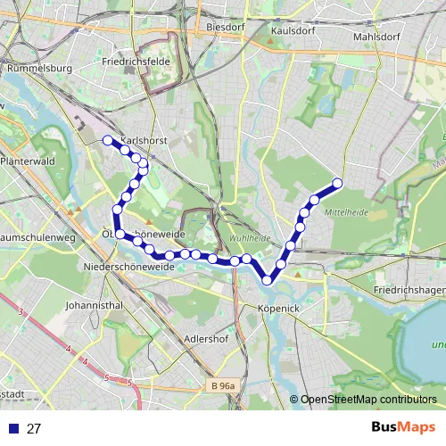 See why over 2 million users trust and consider busmaps.com as the best public transport website. busmaps gives you Berlin Trams suggested routes, real-time bus tracker, line route maps in Berlin, and helps to find the closest 27 tram stops near you. No internet available? Download an offline PDF map and bus schedule for the 27 tram to take on your trip.