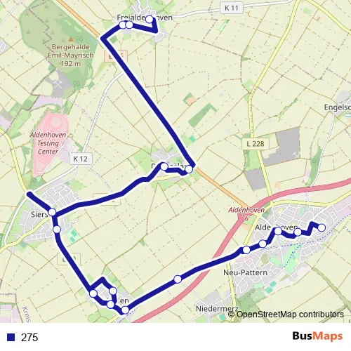 The first stop of the 275 bus route is Aldenhoven, Siersdorf Grundschule and the last stop is Aldenhoven, Freialdenhoven Schulstraße. 275 is operational during on weekdays.
