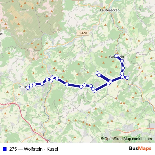 The first stop of the 275 bus route is Wolfstein, Markt and the last stop is Kusel, Bahnhof Bstg 3. 275 (Wolfstein - Kusel) is operational during on weekdays.