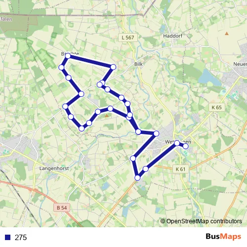 The first stop of the 275 bus route is Wettringen, Schulzentrum and the last stop is Rothenberge, Pröbsting. 275 is operational during on weekdays.