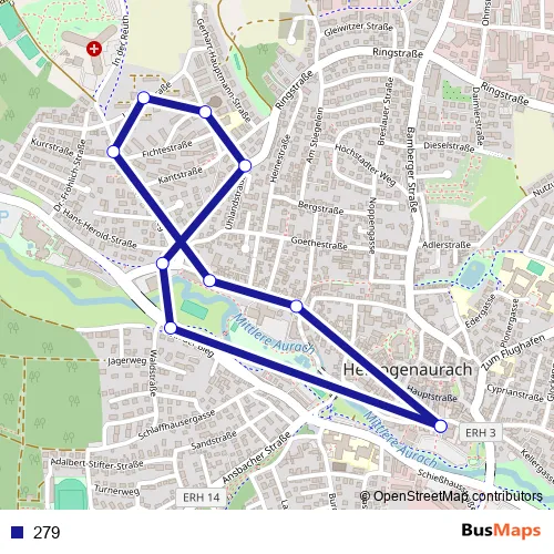 The first stop of the 279 bus route is Herzogenaurach An der Schütt and the last stop is Herzogenaurach An der Schütt. 279 is operational during everyday.