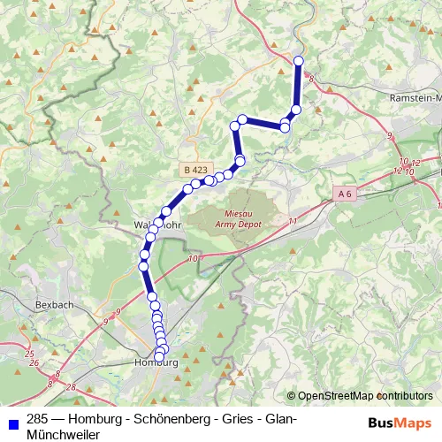 The first stop of the 285 bus route is Glan-Münchweiler, Bahnhof and the last stop is Homburg, Industrie-West. 285 (Homburg - Schönenberg - Gries - Glan-Münchweiler) is operational during everyday.
