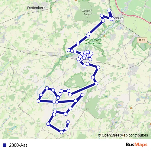 The first stop of the 2860-Ast bus route is Wiemark, Jeftkamp and the last stop is Horneburg, Issendorfer Straße. 2860-Ast is operational during everyday.