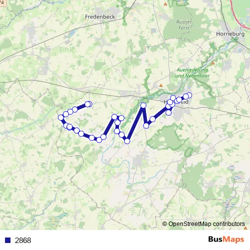 The first stop of the 2868 bus route is Brest(Kr Stade) Dorfgemeinschaftshaus and the last stop is Harsefeld Hellwege Allee. 2868 is operational during everyday.