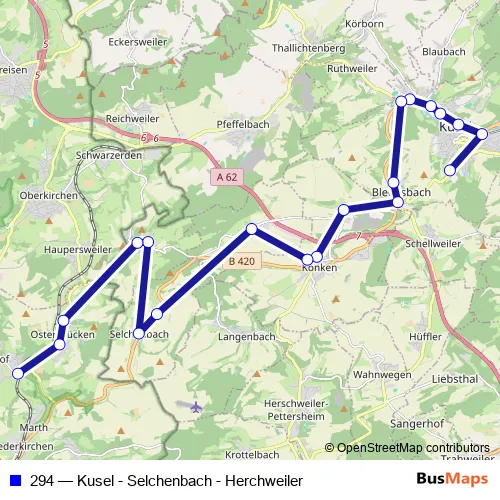 The first stop of the 294 bus route is Kusel, Roßberg Schulzentrum and the last stop is Hoof, Bahnhof. 294 (Kusel - Selchenbach - Herchweiler) is operational during on weekdays.