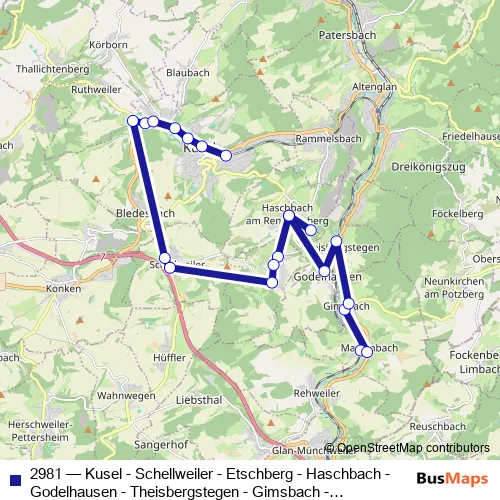 Click here to view the nearest 2981 - Kusel - Schellweiler - Etschberg - Haschbach - Godelhausen - Theisbergstegen - Gimsbach - Matzenbach bus stop.